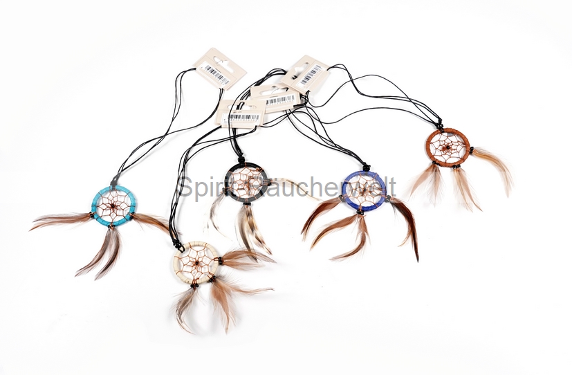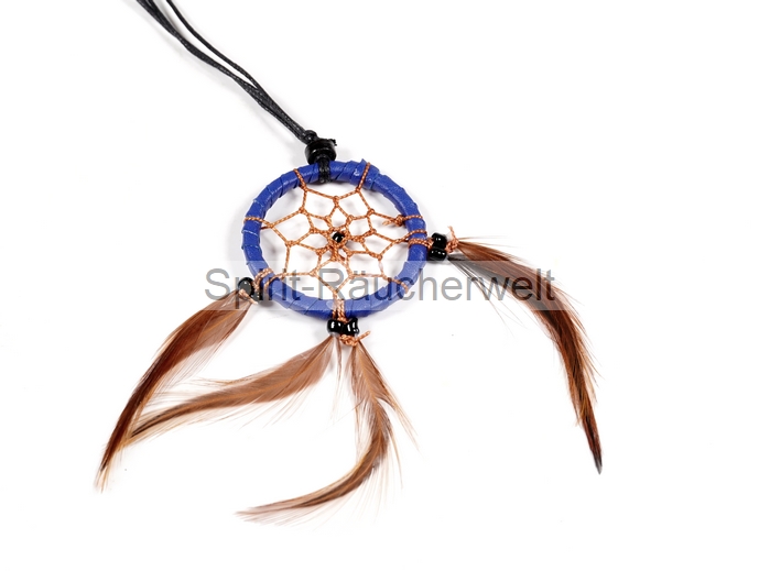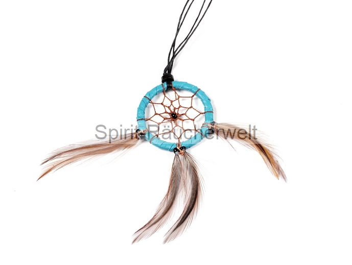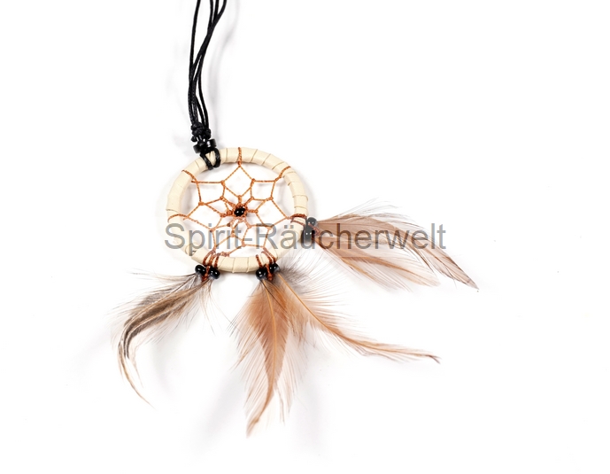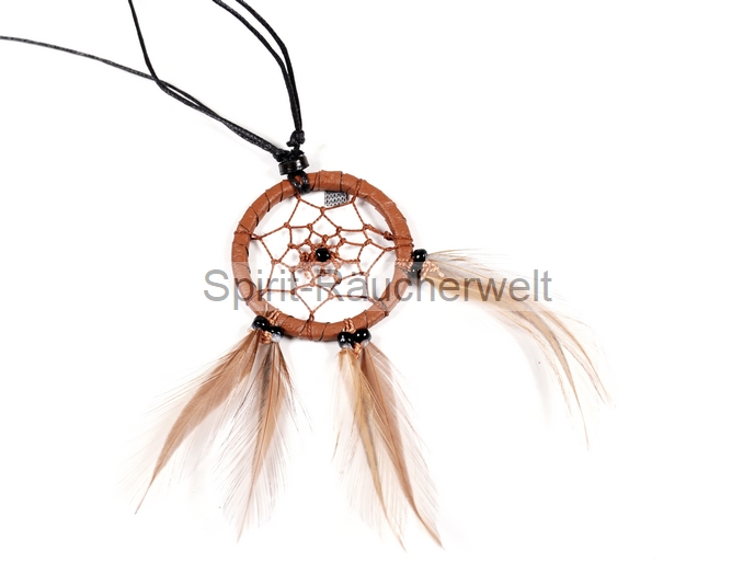 Der kleine Traumfänger-Anhänger ist mit lederähnlichem Material umwickelt und mit Perlen und Federn verziert.
