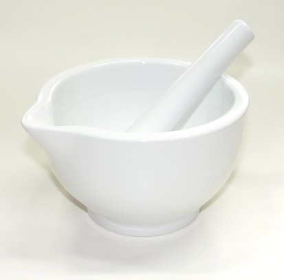 Mörser aus weißem Porzellan, bestehend aus Reibeschale und Stößel, in verschiedenen Größen.