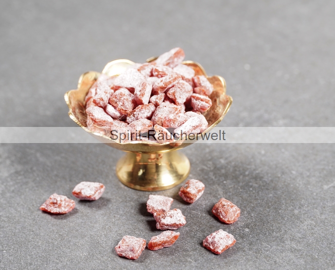 Rosenweihrauch läßt sich sowohl auf dem Räucherstövchen - hier im Mörser pulverisieren und auf die Sandauflage des Siebes streuen. Wenn genügend Sand auf dem Räuchersieb ist, verbrennt nichts mehr und Sie können den feinen Rosenweihrauchduft genießen. Auch auf Räucherkohle läßt sich Rosenweihrauch klassisch verräuchern. Hier nur kleine Portionen auflegen und die angeglimmten Harzrückstände mit der Räucherzange wieder von der Kohle entfernen um unangenehmen Brandgeruch zu vermeiden. Bei Bedarf anschließend wieder eine kleine Portion Rosenweihrauch auflegen.