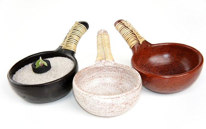 Räucherpfanne aus Lombok-Ton. Formschönes Räucherpfännchen mit geflochtener Rattanverzierung am Griff. Das Räucherpfännchen eignet sich sehr gut für energetische Hausräucherung. Man kann es bequem am Griff halten und damit sicher durch die Räume gehen.