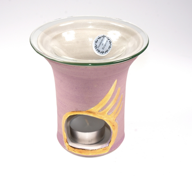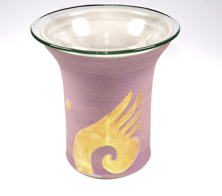 Edle, kunsthandwerkliche Duftlampe mit großer Glasschale aus regionaler, bayrischer Werkstatt. Die Innenglasur ist hell, außen ist sie matt violett mit einem glänzendem Engelsflügelmotiv aus Echtgold bemalt. Der sehr dekorative Engelsflügel-Ausschnitt verleiht ihr eine elegante Note.