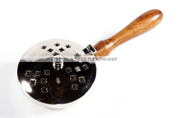 Diese Weihrauchpfanne besticht durch das klare Design. Auf dem Deckel sind kleine Öffnungen, durch die der Rauch abziehen und sich duftend im Raum verteilen kann. Die Räucherpfanne steht auf vier kleinen Kugelfüßchen und hat einen 10cm langen Holzgriff. Der Deckel ist aufklappbar (nicht abnehmbar). Die Pfanne eignet sich zum Ausräuchern mit Weihrauch. Man kann sie gut in der Hand halten und durch die Räume gehen.