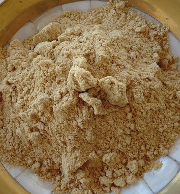 Damit sich das getrocknete Gummiharz zu Pulver mahlen lässt, wird es mit 70% Bockshornkleesamen vermischt.