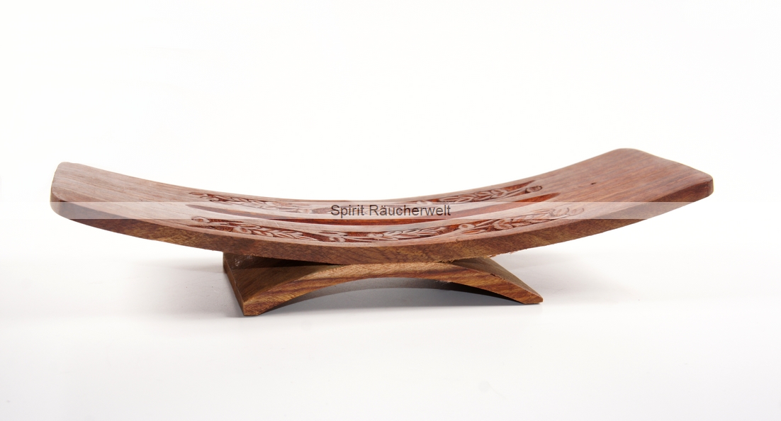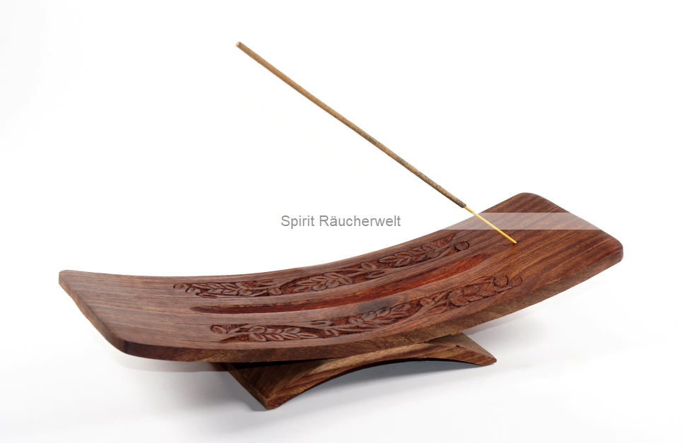 Extra breiter Räucherstäbchenhalter aus Sheeshamholz mit dekorativen Blätterranken.