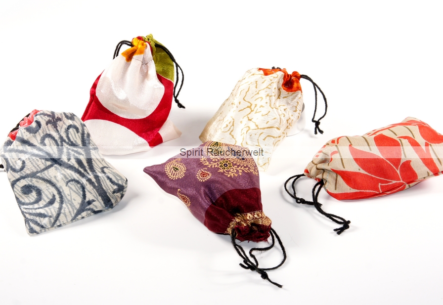 Kleine, bunte Stoffbeutelchen-Säckchen, die mit einem Zugband oben verschlossen werden können.