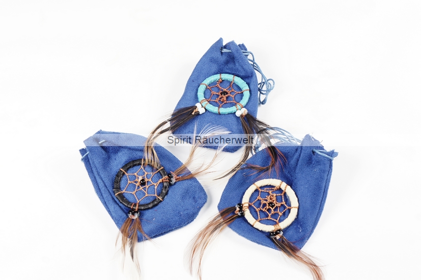 Kleines blaues Beutelchen zum Aufbewahren von diversen schamanischen Utensilien, Kräutern oder Räucherwerk. Der Beutel ist aus weichem wildlederähnlichem Material gefertigt. Auf der Vorderseite ist er mit einem handgearbeiteten Traumfänger, Perlen und Federn verziert. Er hat eine lange Zugkordel und kann auch als Brustbeutel getragen werden.