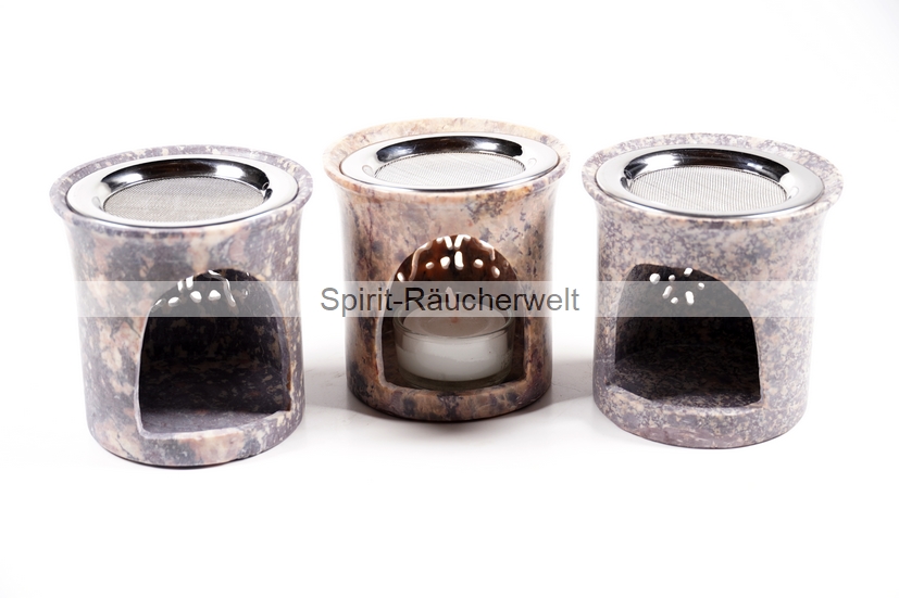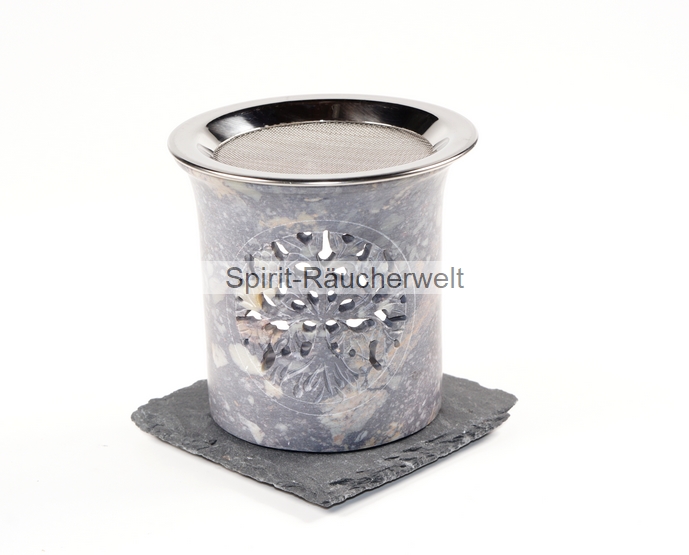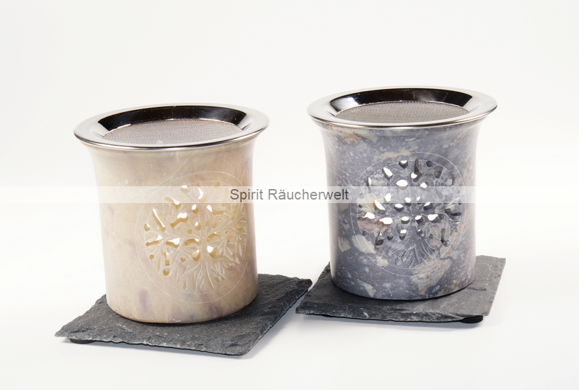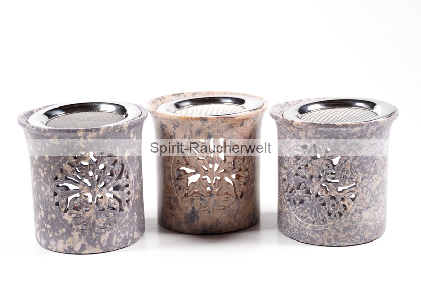 Kleines, zylindrisches Räucherstövchen aus Speckstein mit Edelstahlsieb in verschiedenen Naturtönen. Die Farbgebung reicht von hellem beige bis zu dunklem Grau. Da es sich um einen Naturstein handelt, fällt jedes Stövchen farblich anders aus. Das gezeigte Bild ist nur ein Beispiel. Auf der Vorderseite ist es mit einem schön gearbeiteten Baum des Lebens Symbol verziert.