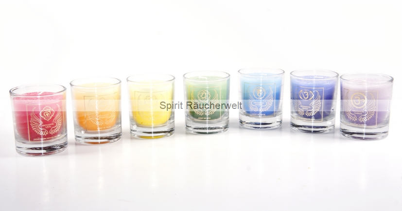 Sie erhalten hier ein günstiges Fairtrade Duftkerzenset mit ätherischen Ölen und goldfarbenem Engelsflügel und Chakra Symbol - im recyceltem Glas. Diese Kerzen haben einen Baumwolldocht, der für beinahe rauchfreies Abbrennen sorgt