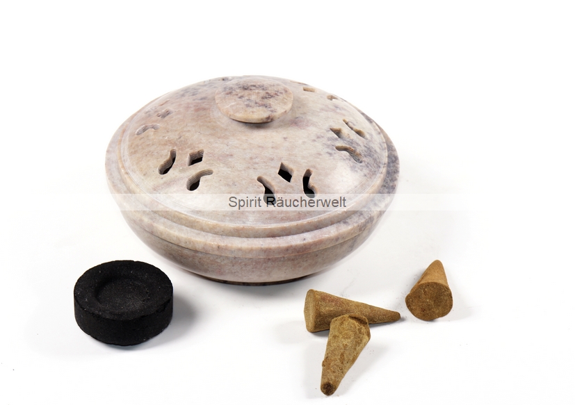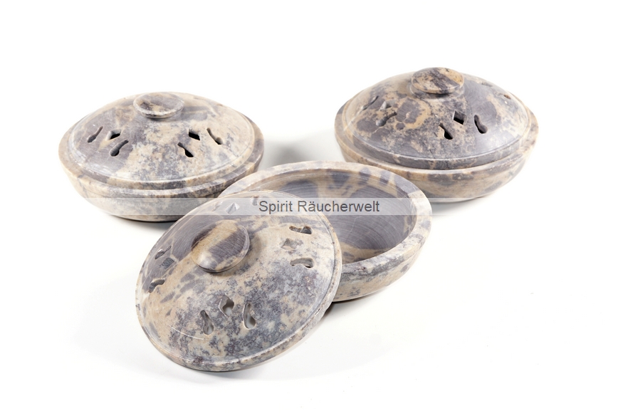 Kleine Räucherschale-Räucherdose mit Deckel aus Speckstein zum Räuchern mit kleiner Kohle. Im schön gearbeiteten Deckel mit sind kleine Löcher eingearbeitet, durch die der Rauch abzieht.