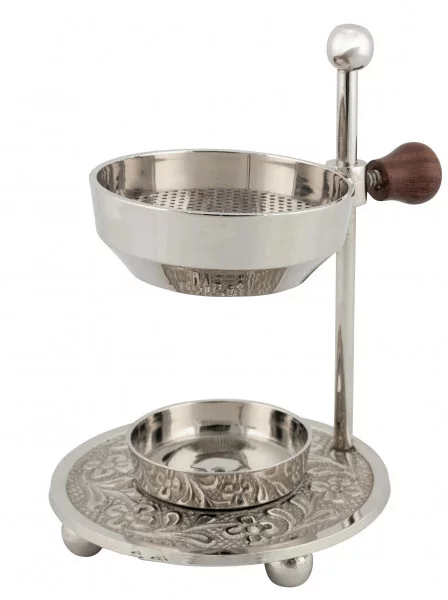 Hochwertiges, stabiles Weihrauchstövchen mit Sieb aus Messing vernickelt zum Räuchern mit dem Teelicht. Die Weihrauchschale kann individuell in der Höhe eingestellt und mittels der handlichen 4cm langen Schraube auf der gewünschten Höhe fest arretiert werden. Den Abschluß der Schraube bildet ein dekorativer, gedrechselter Holzknopf. Der Boden des Stövchen ist mit einem floralen Prägemuster verziert.