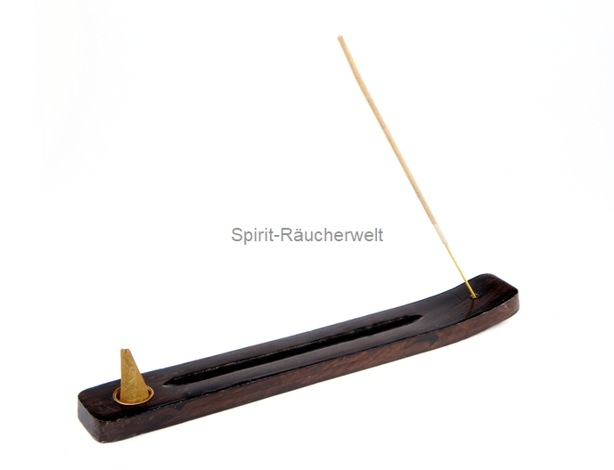 Praktischer Kombi-Räucherstäbchenhalter aus dunklem Holz mit eingearbeitetem Kegelhalter aus Messing.