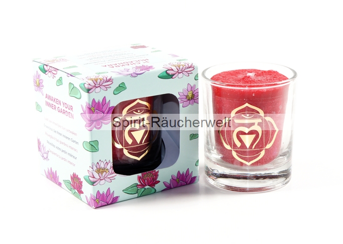 Chakra-Votivduftkerze im Glas, verpackt in einer hübschen Geschenkbox. Auf der Vorderseite des Glases befindet sich ein dekoratives, goldenes Chakrasymbol. Die Kerze wurde unter Fair-Trade-Bedingungen aus hochwertigem, Green-Palm-zertifiziertem Wachs und natürlichen ätherischen Ölen hergestellt. Sie brennt nahezu rauchfrei mit einer stabilen Flamme ab.