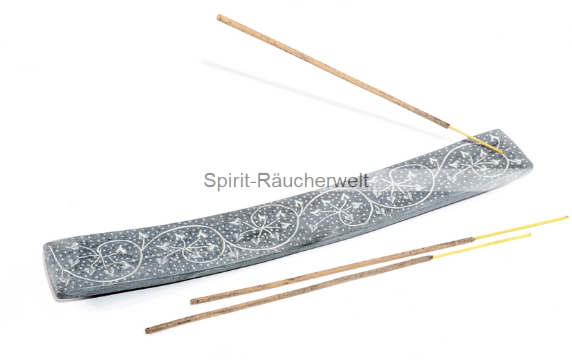 Lieferumfang: Räucherstäbchenhalter aus hellgrauem Speckstein mit Blätterranken