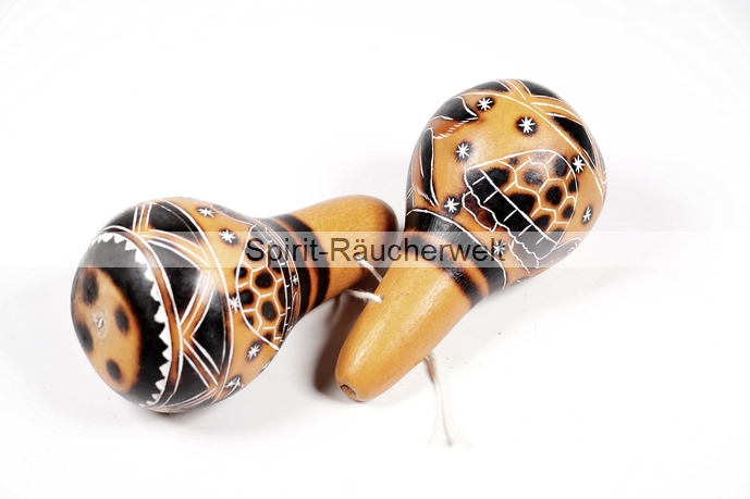 Jede Rassel ist somit ein Unikat. Sie sind in reiner Handarbeit mit figürlichen (indianischen Motiven) Schnitzerein liebevoll verziert.