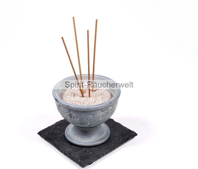 Räucherstäbchen in die mit Sand gefüllte Schale stecken.