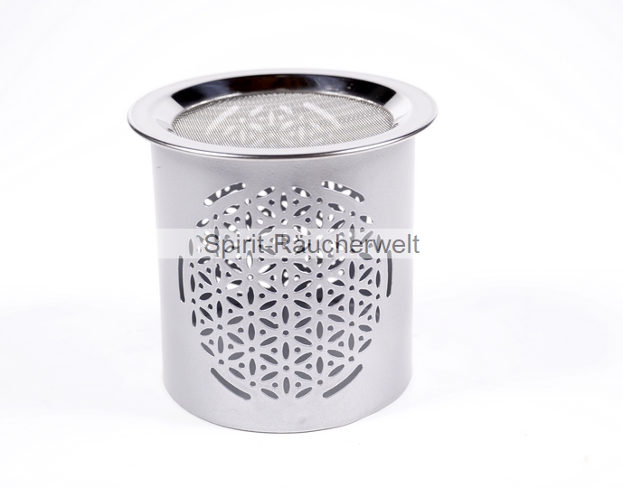 Sie erhalten ein modernes, matt-silberfarbenes Metall-Räucherstövchen mit Blume des Lebens Symbol. Dieses Stövchen wird in Handarbeit hergestellt. Es hat ein 9cm Edelstahlsieb, das Teelicht wird von oben eingestellt.