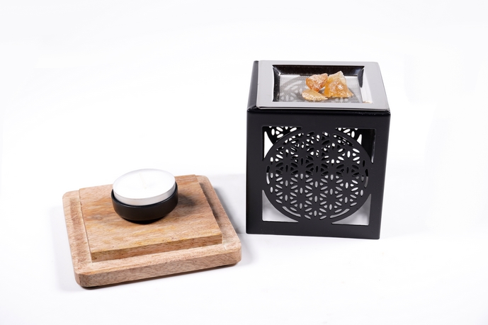 Trendiges quadratisches 3 teiliges schwarzes Metall-Räucherstövchen mit Blume des Lebens Symbol auf allen vier Seiten. Das Metallgehäuse lässt sich vom Holzsockel abnehmen. Somit kann das Teelicht bequem eingestellt werden Dieses Stövchen wird in Handarbeit hergestellt. Für das energetisierende Räuchern mit Kräutern oder Kräuterräuchermischungen. Durch das Kerzenlicht wirft es zusätzlich zur Räucherung ein mystisches Licht- Schattenspiel in den Raum.