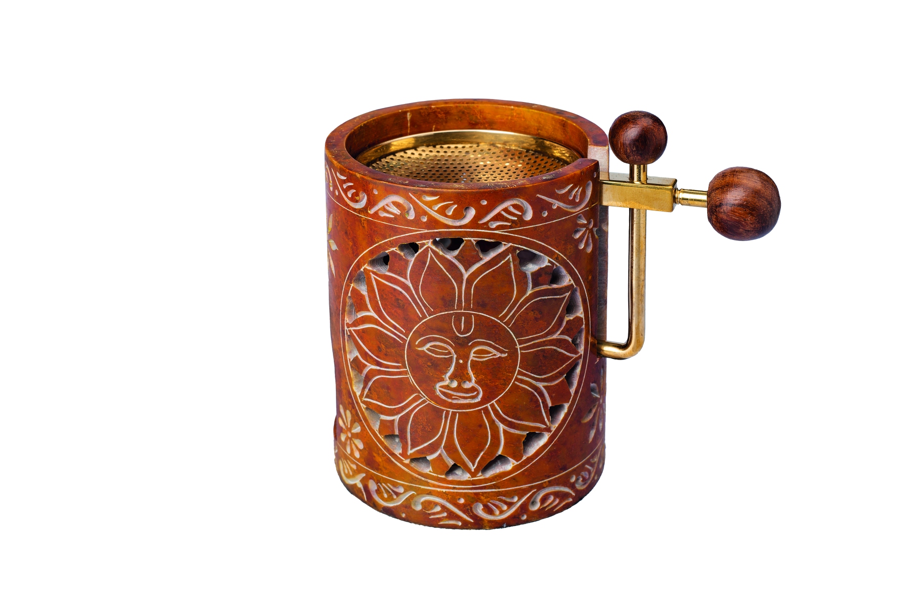 Das Stövchen ist aus goldgelbem Speckstein und mit feinen Gravuren und dem Motiv Sonne verziert.