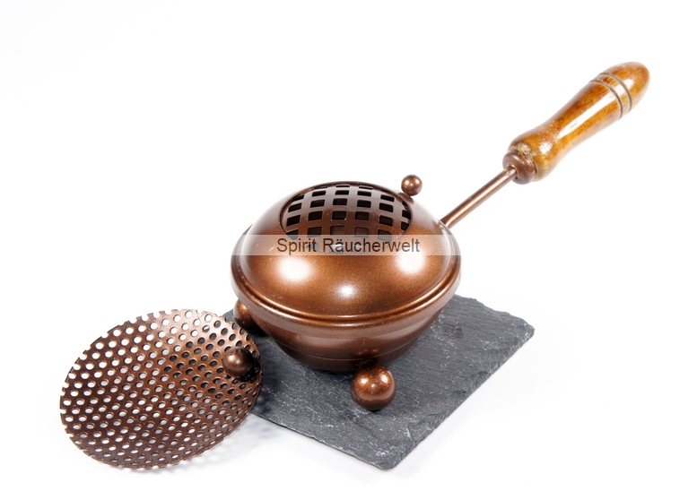 Stabiles Räucherpfännchen aus Eisen - kupferfarben, mit herausnehmbarem Sieb und Holzgriff. Der Deckel ist mit einem Scharnier fest mit der Pfanne verbunden, somit kann er nicht verrutschen oder herunterfallen.