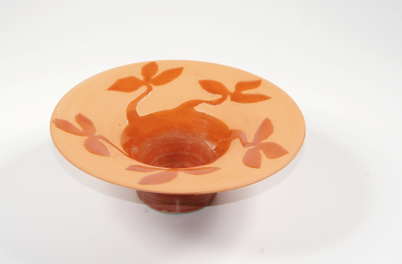 Dekorative kunsthandwerkliche Keramik-Räucherschale aus Bayern. Sie ist mit glänzend roten Blättermotiven auf mattem Grund bemalt.
