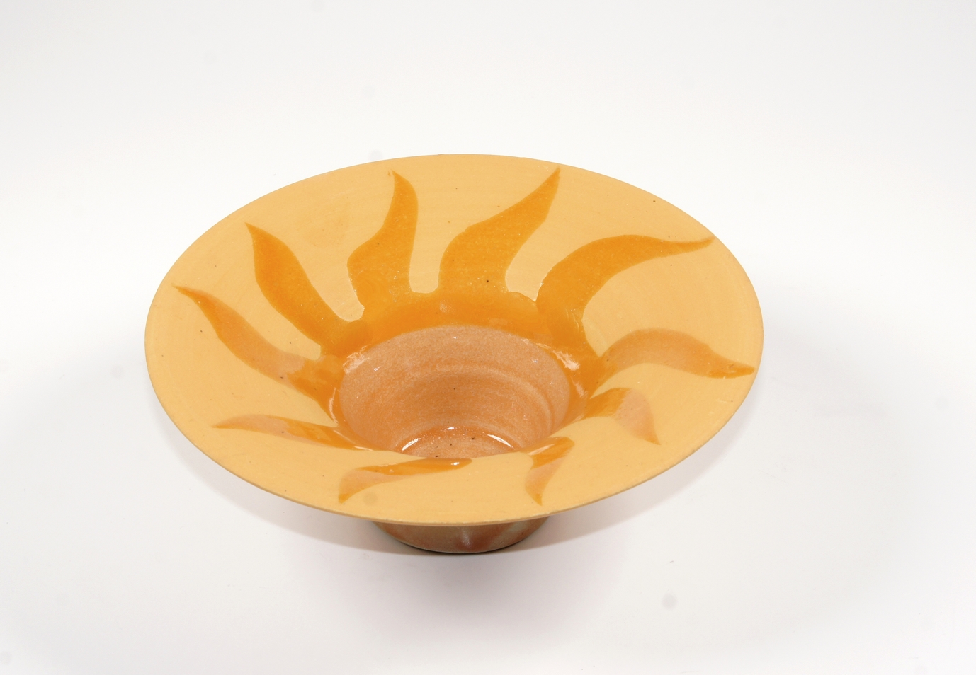 dekorative kunsthandwerkliche Keramikschale aus Bayern. Die Schale ist mit einem glänzenden ockerfarbenem Sonnenmotiv auf mattem Grund bemalt.