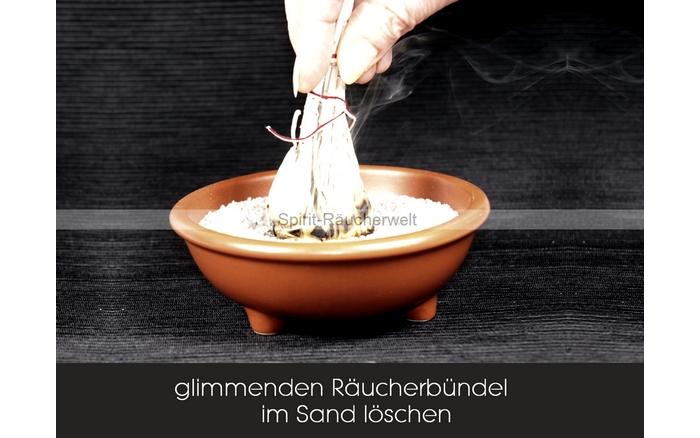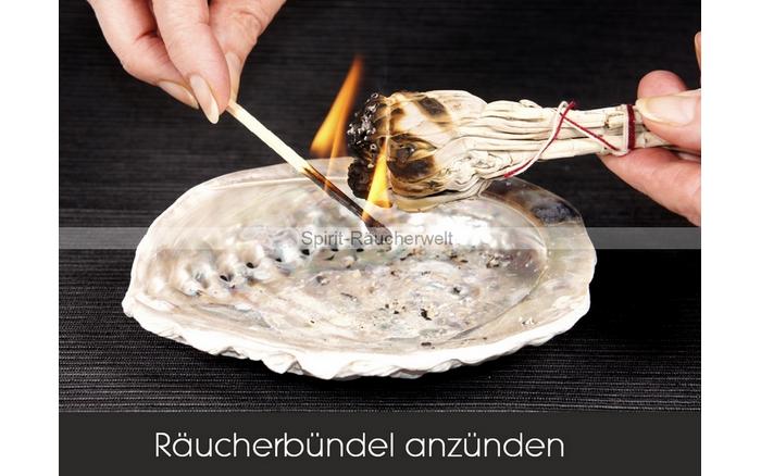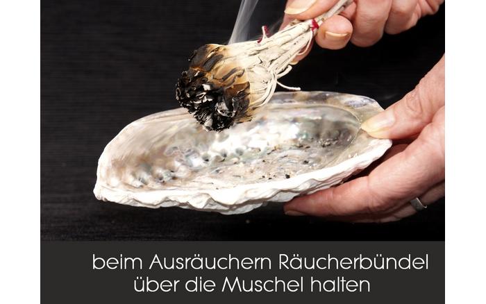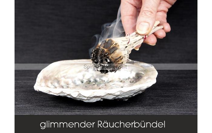 Beim Räuchern mit dem Bündel immer eine Muschel oder Tablett unter das glimmende Bündel halten, damit eventuell herabfallende Asche und Kräuterreste aufgefangen werden.